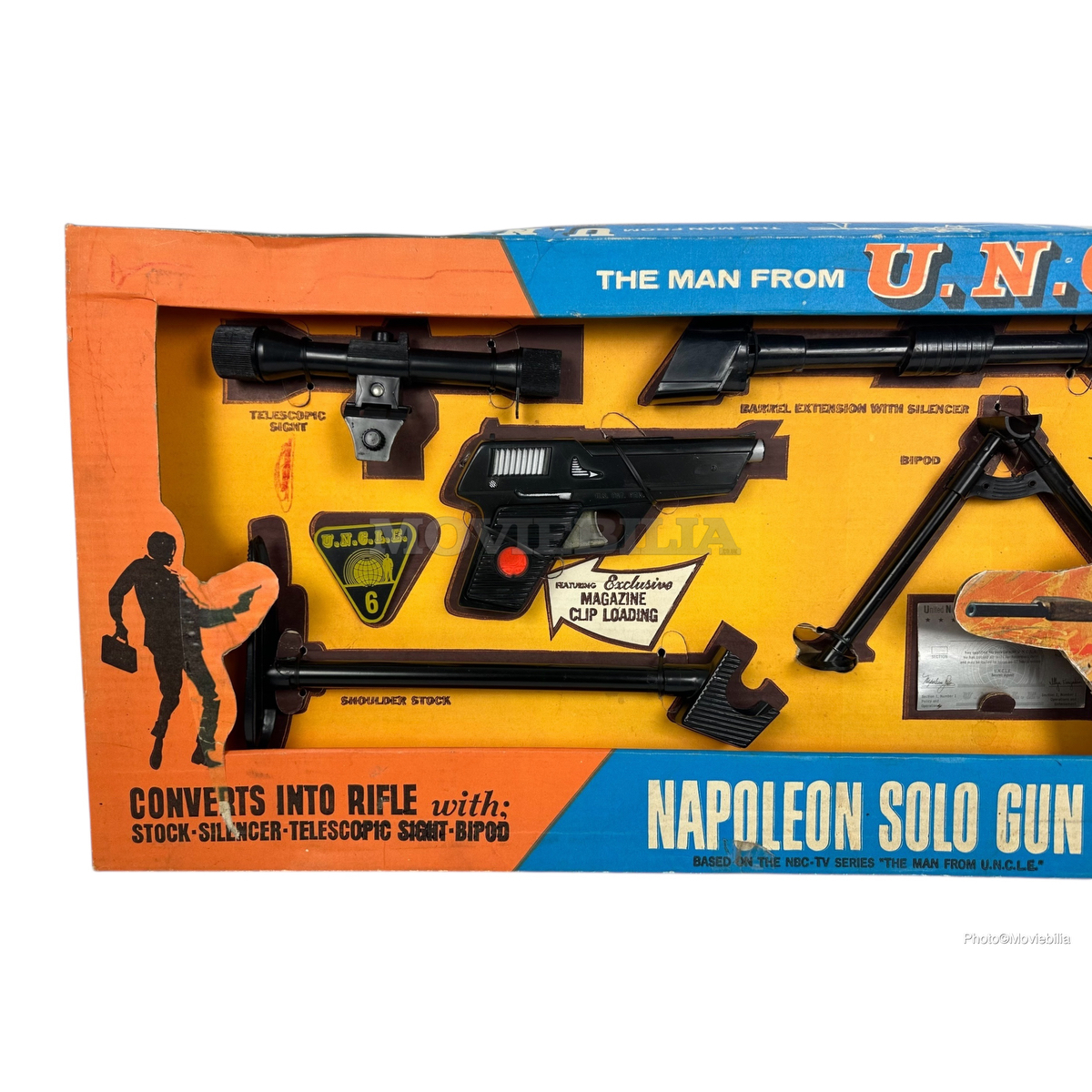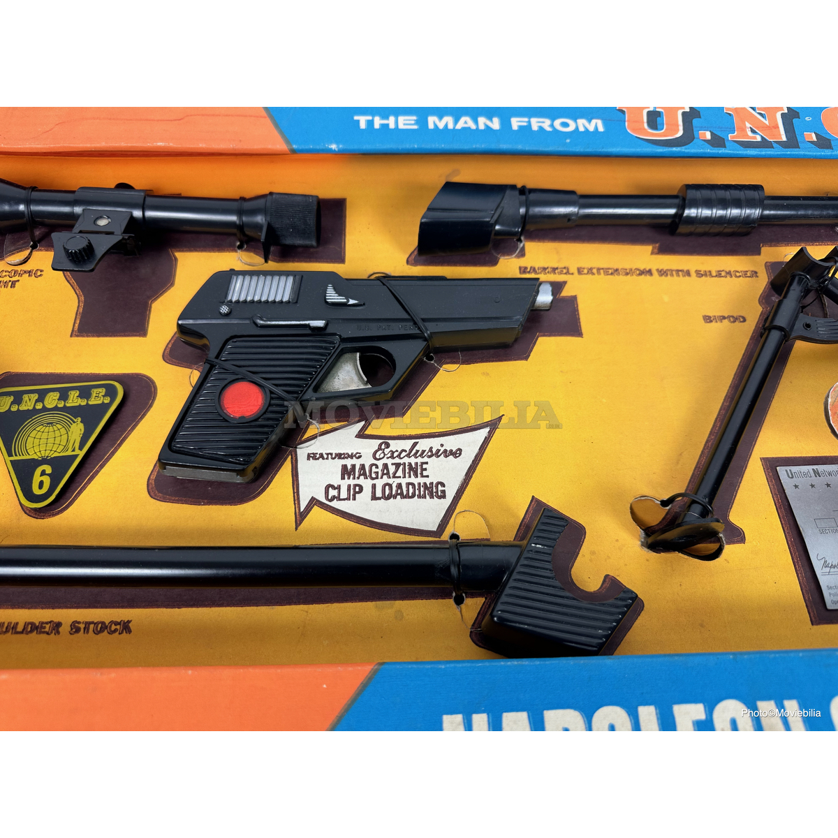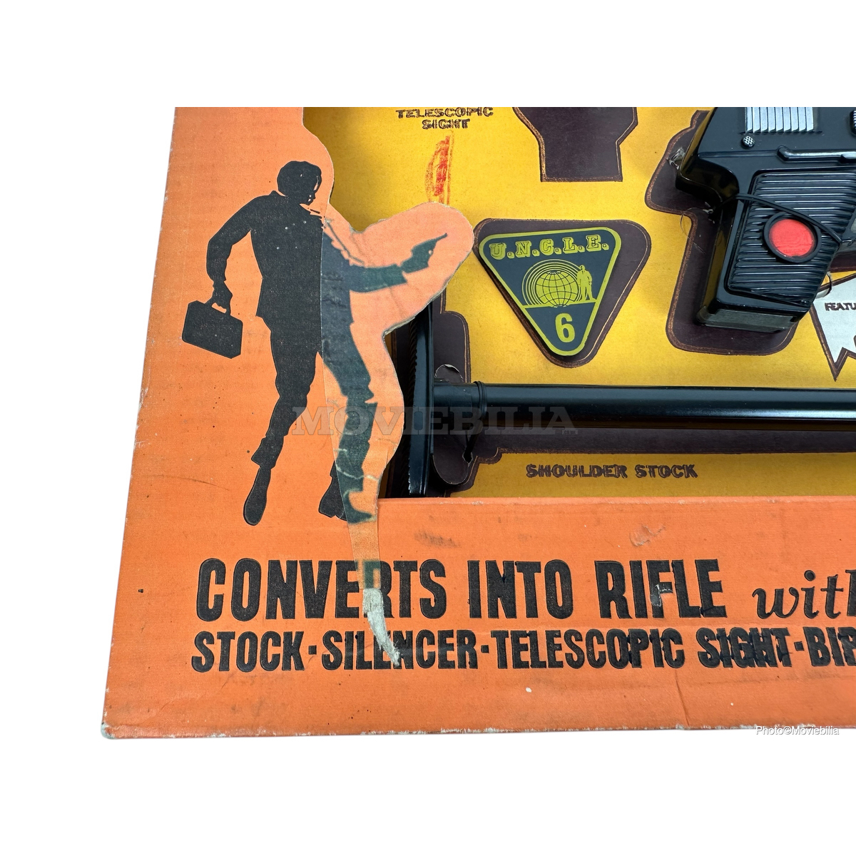 Complete. Gun Sight accessory has slight damage to one side. Original box has a replacement Napoleon Solo die cut card cut to the front bottom right and the right hand section of the black male silohette on the front left of the box has been carefully replaced. The box exhibits minor pen marks.