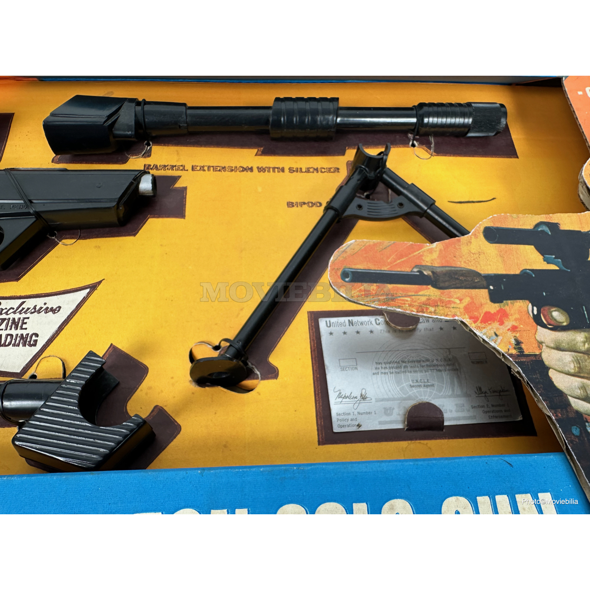 Contents: Luger, Holster, Silencer, Scope, Stock, Solo Cigarette Case with concealed Mini Gun, Walkie Talkies, Handcuffs, Fountain Pen, Pen Ink Cartridge, Embossed ID Badge, Operating Instructions and Passport.